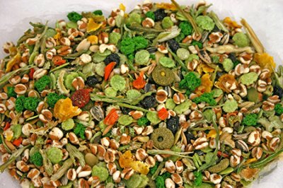 Innehåll: Sorgum röd, Rent kanariefrö, Vicker, Strimmigt solrosfrö, Havre, Vetepuffar, Krossade jordnötter, Majs flakes, Gröna majskroketter, Torkade persiljestjälkar, Morotsflis, Krokett ringar, Russin, Pumpafrö.