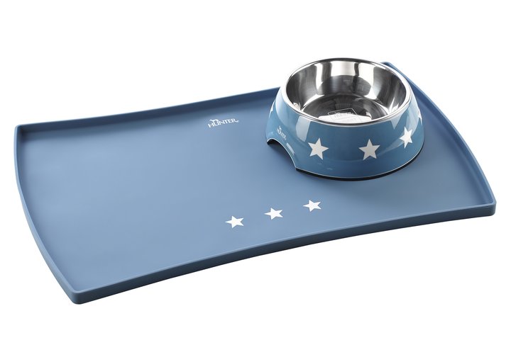 Underlägg i silikon för mat- och vattenskålar. Underlägget kan enkelt rengöras och kan även diskas i diskmaskin. Underlägget har en extra hög kant för att skydda golvet från vätska och är dekorerat med vita stjärnor.