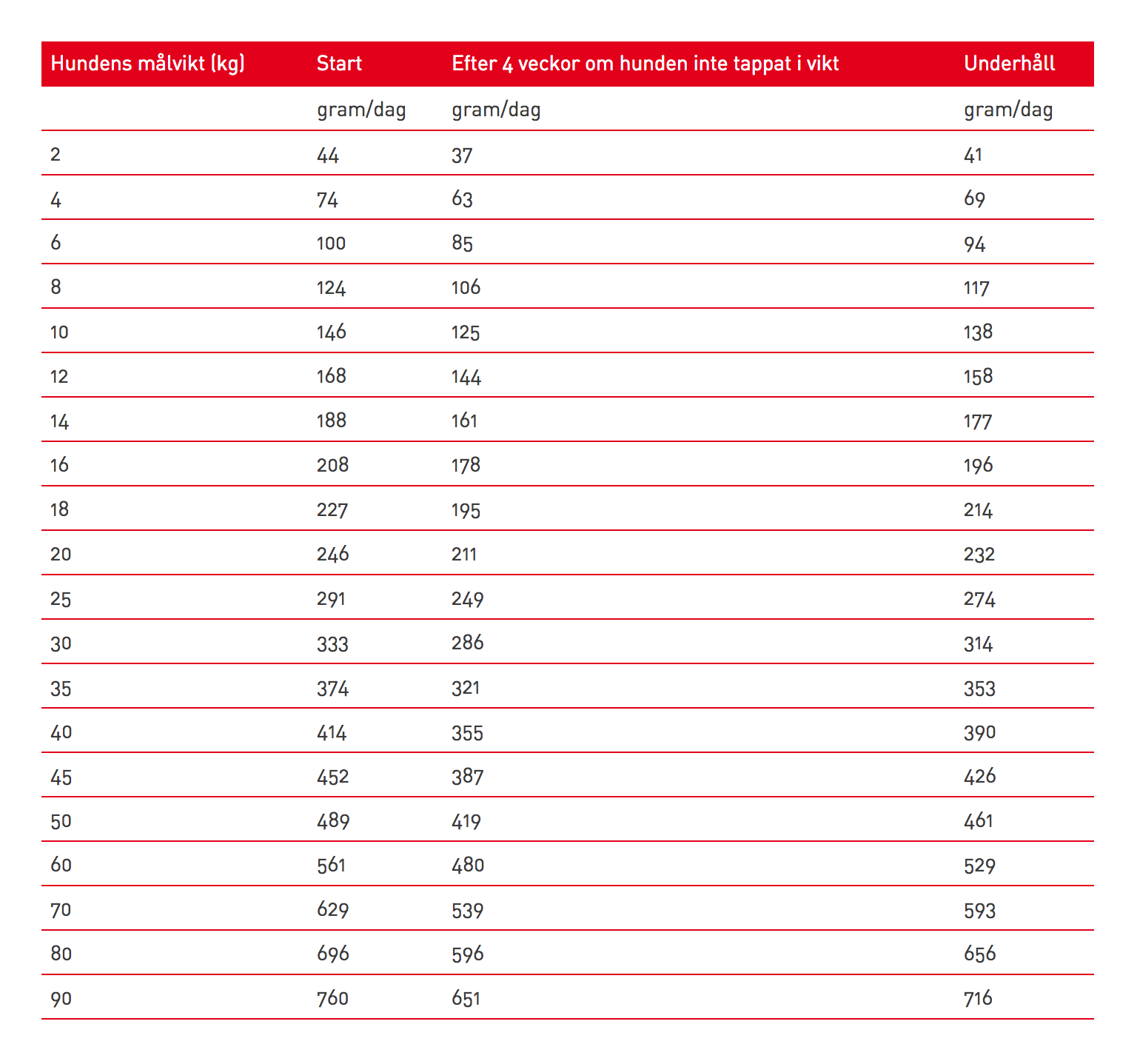 Dessa mängder skall endast ses som en vägledning, eftersom katters och hundars behov varierar.