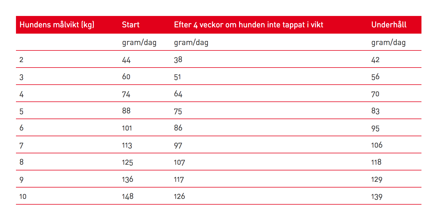Dessa mängder skall endast ses som en vägledning, eftersom katters och hundars behov varierar.