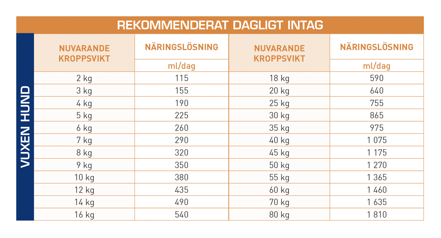 - Komplett och balanserad flytande näringslösning för att främja återhämtning och konvalescens hos hundar som kräver enteral nutrition.