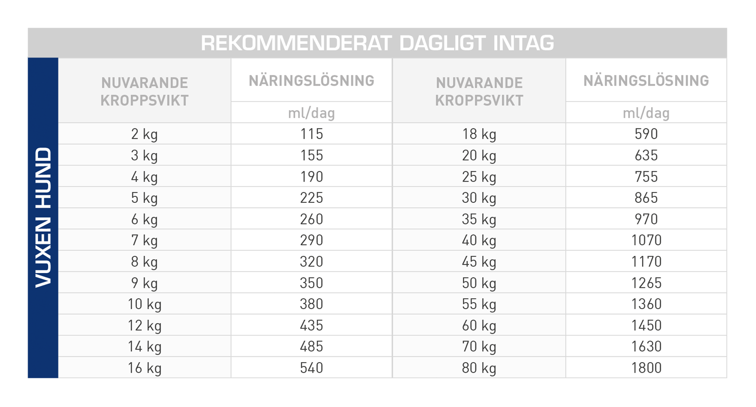 Mängden foder bör anpassas till individen efter en klinisk utvärdering av hunden.