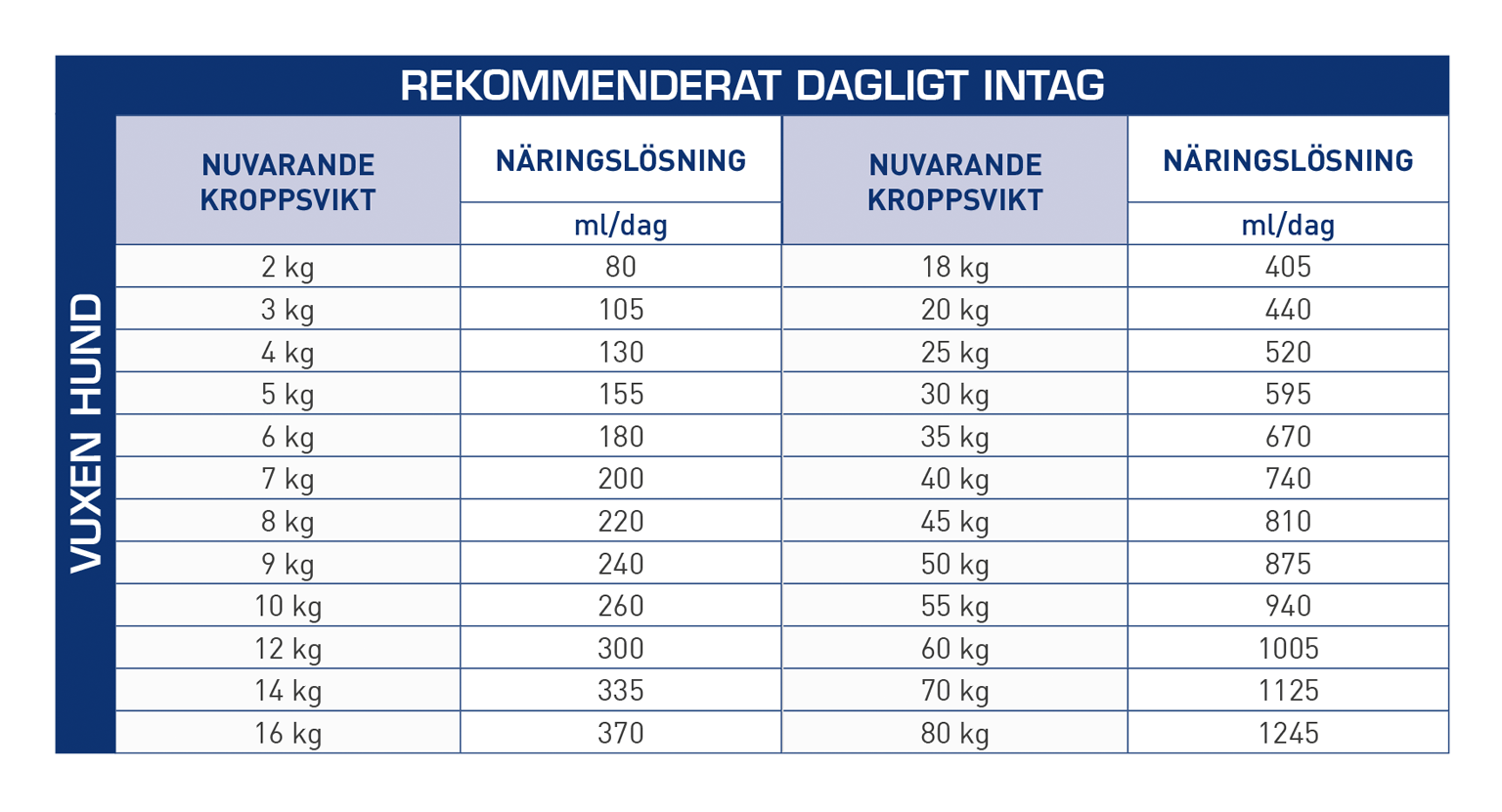 Dessa mängder skall endast ses som en vägledning, eftersom katters och hundars behov varierar. Anpassa utfodringsmängden så optimal kroppsvikt behålls.