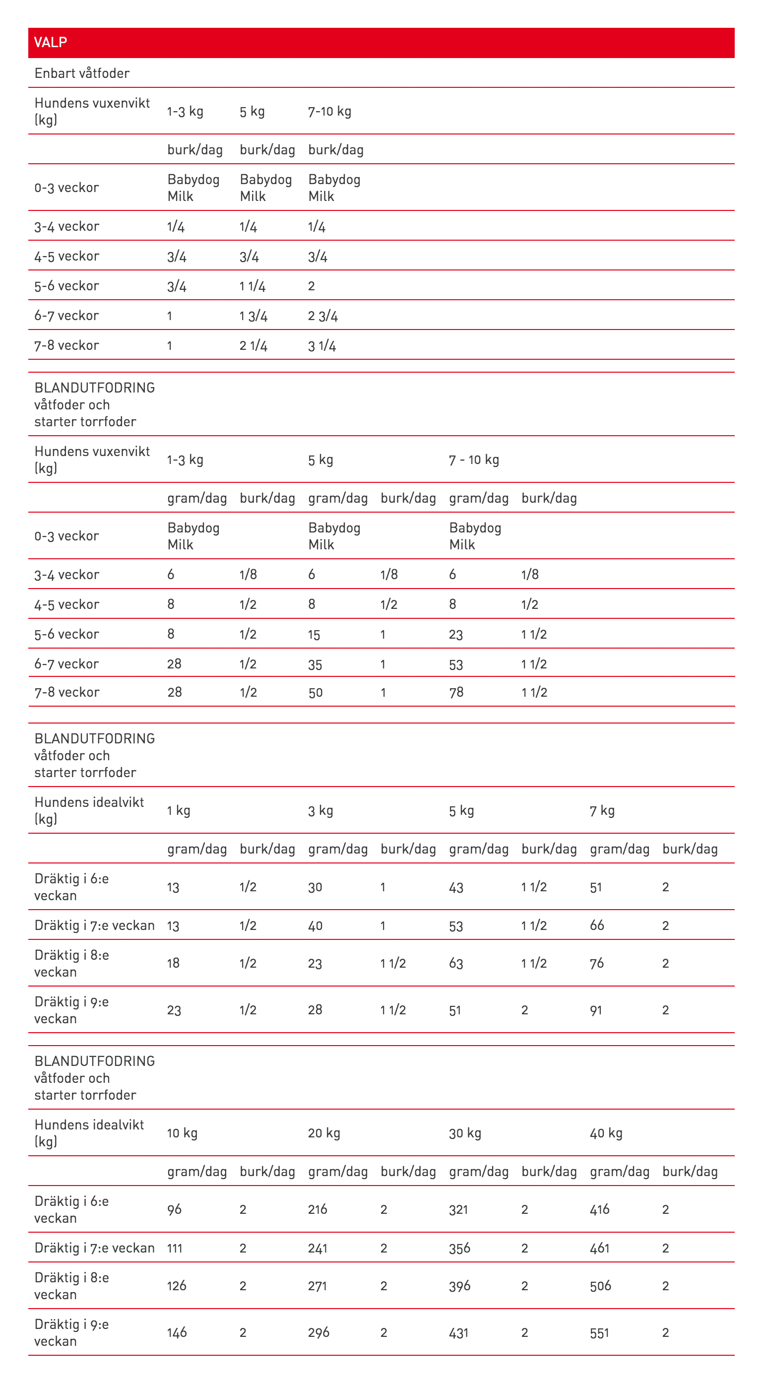 Dessa mängder skall endast ses som en vägledning, eftersom katters och hundars behov varierar.