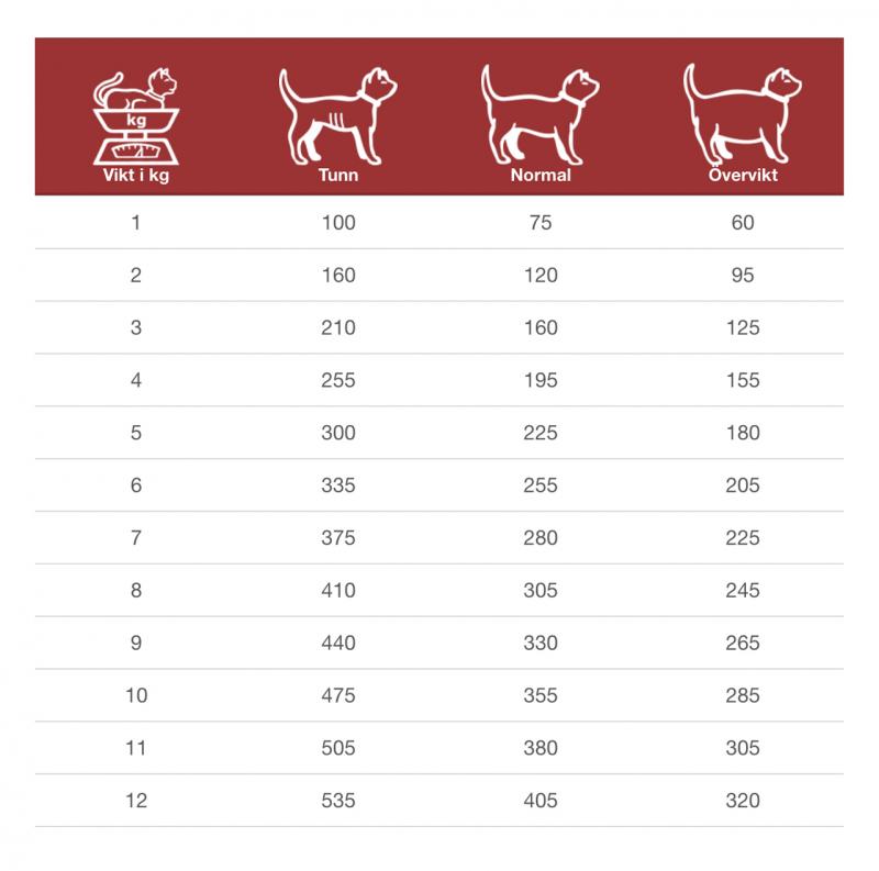 Det dagliga behovet kan variera beroende på faktorer som ras, miljö, säsong och aktivitetsnivå. Vi rekommenderar att du övervakar ditt djur och justerar utfodringsmängden för att passa dess individuella behov.