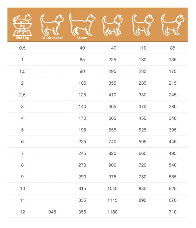 Det dagliga behovet kan variera beroende på faktorer som ras, miljö, säsong och aktivitetsnivå. Vi rekommenderar att du övervakar ditt djur och justerar utfodringsmängden för att passa dess individuella behov.