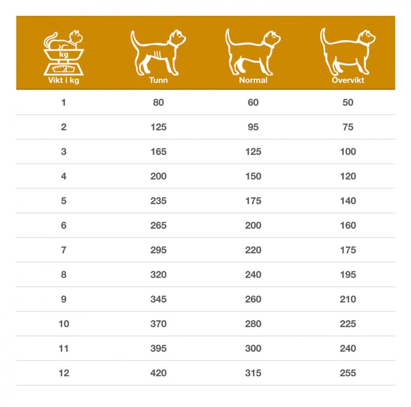 Det dagliga behovet kan variera beroende på faktorer som ras, miljö, säsong och aktivitetsnivå. Vi rekommenderar att du övervakar ditt djur och justerar utfodringsmängden för att passa dess individuella behov.