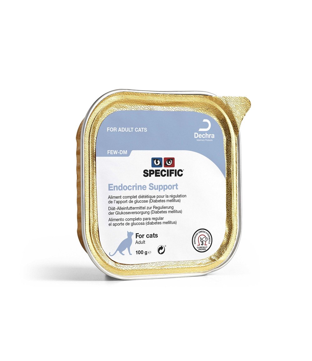 SPECIFIC Endocrine Support är ett våtfoder för stöd till katter med diabetes mellitus. Fodret har mycket låg kolhydratnivå vilket hjälper till att reglera blodsockernivån.