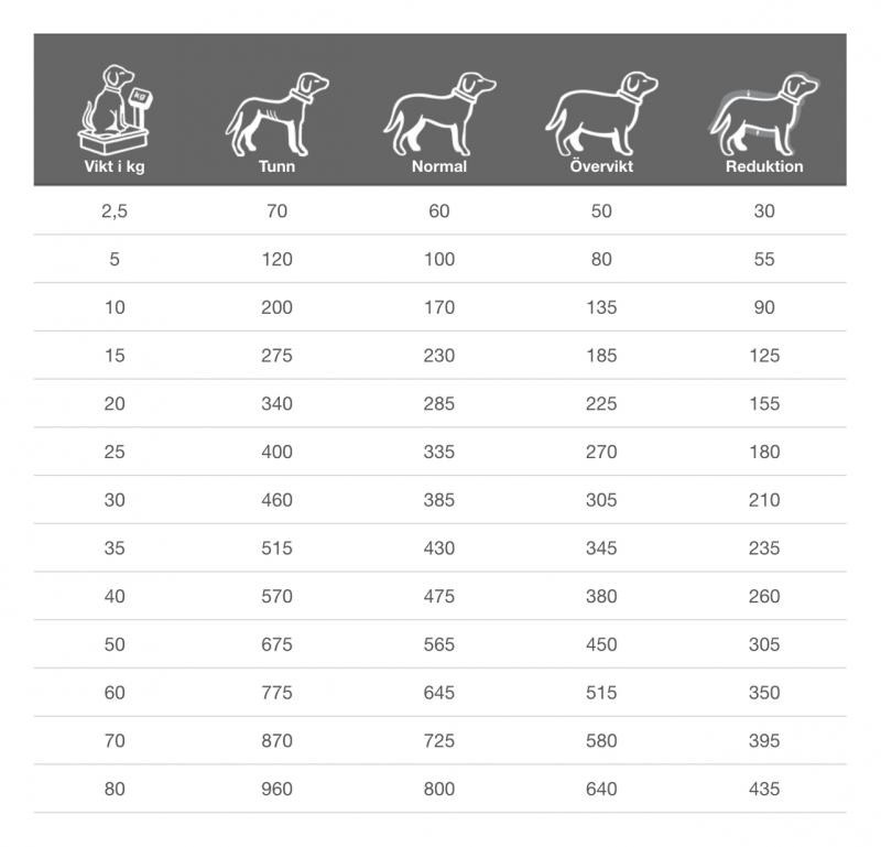 Det dagliga behovet kan variera beroende på faktorer som ras, miljö, säsong och aktivitetsnivå. Vi rekommenderar att du övervakar ditt djur och justerar utfodringsmängden för att passa dess individuella behov.
