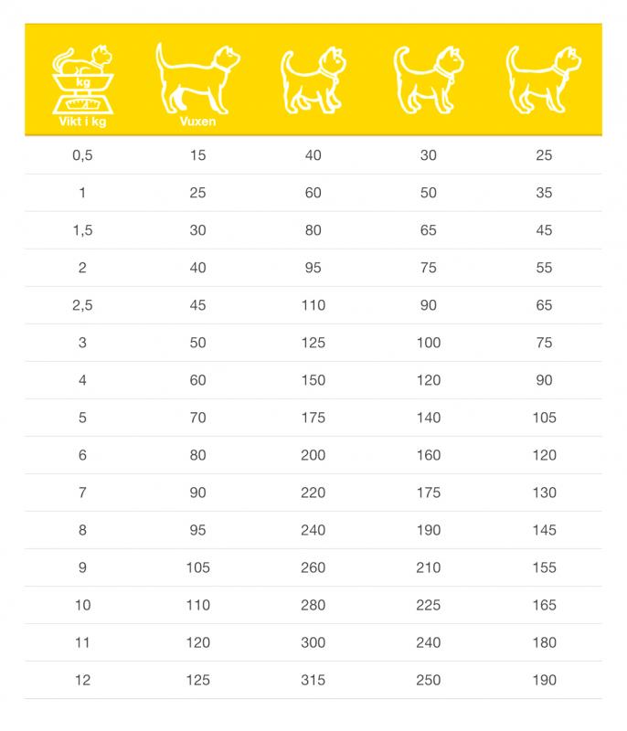 Det dagliga behovet kan variera beroende på faktorer som ras, miljö, säsong och aktivitetsnivå. Vi rekommenderar att du övervakar ditt djur och justerar utfodringsmängden för att passa dess individuella behov.