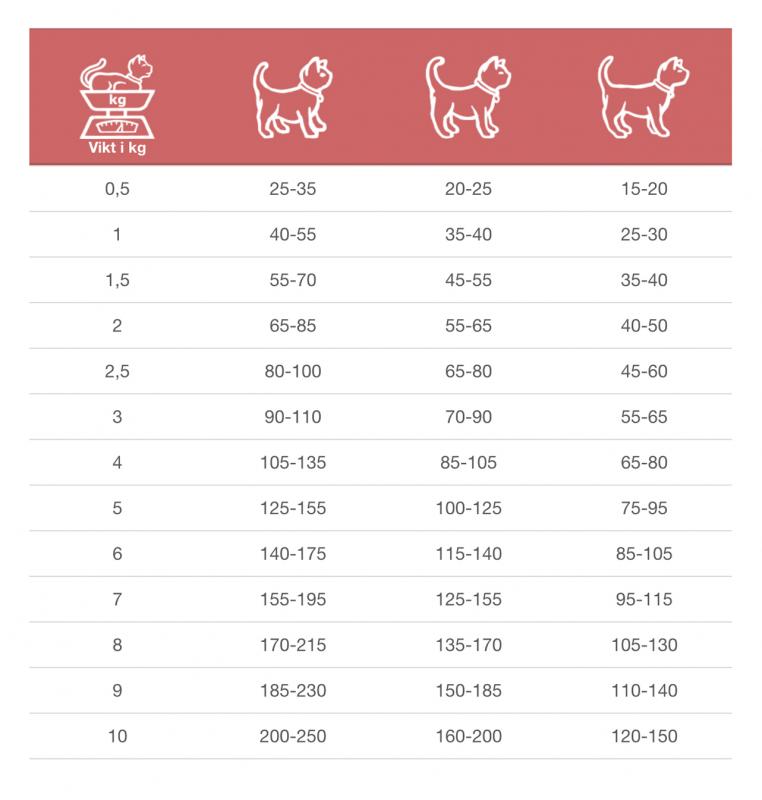 Det dagliga behovet kan variera beroende på faktorer som ras, miljö, säsong och aktivitetsnivå. Vi rekommenderar att du övervakar ditt djur och justerar utfodringsmängden för att passa dess individuella behov.