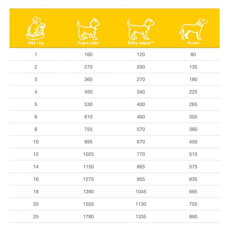 Det dagliga behovet kan variera beroende på faktorer som ras, miljö, säsong och aktivitetsnivå. Vi rekommenderar att du övervakar ditt djur och justerar utfodringsmängden för att passa dess individuella behov.