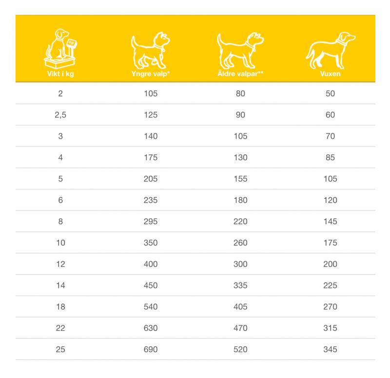 Det dagliga behovet kan variera beroende på faktorer som ras, miljö, säsong och aktivitetsnivå. Vi rekommenderar att du övervakar ditt djur och justerar utfodringsmängden för att passa dess individuella behov.