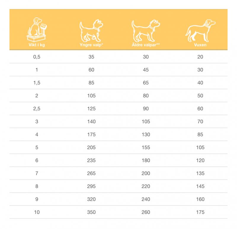 Det dagliga behovet kan variera beroende på faktorer som ras, miljö, säsong och aktivitetsnivå. Vi rekommenderar att du övervakar ditt djur och justerar utfodringsmängden för att passa dess individuella behov.