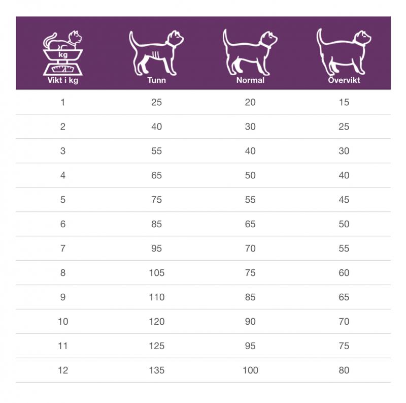 Det dagliga behovet kan variera beroende på faktorer som ras, miljö, säsong och aktivitetsnivå. Vi rekommenderar att du övervakar ditt djur och justerar utfodringsmängden för att passa dess individuella behov.