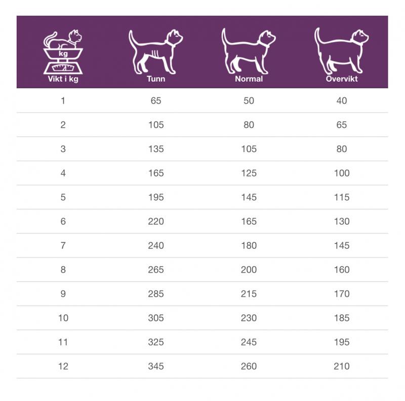 Det dagliga behovet kan variera beroende på faktorer som ras, miljö, säsong och aktivitetsnivå. Vi rekommenderar att du övervakar ditt djur och justerar utfodringsmängden för att passa dess individuella behov.
