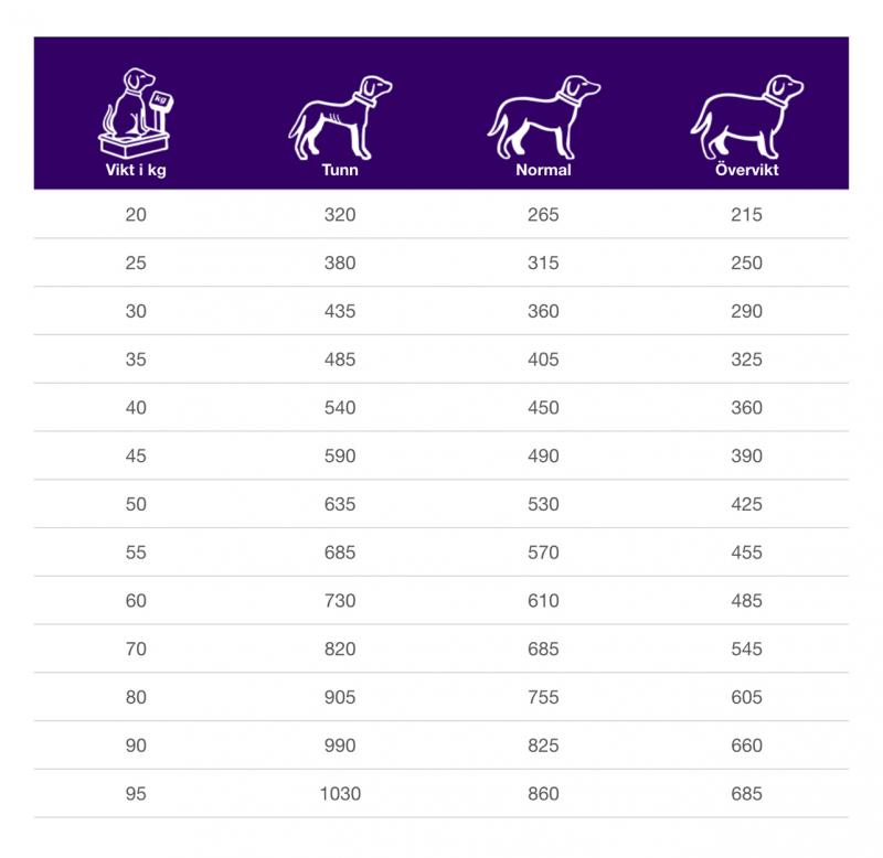 Det dagliga behovet kan variera beroende på faktorer som ras, miljö, säsong och aktivitetsnivå. Vi rekommenderar att du övervakar ditt djur och justerar utfodringsmängden för att passa dess individuella behov.