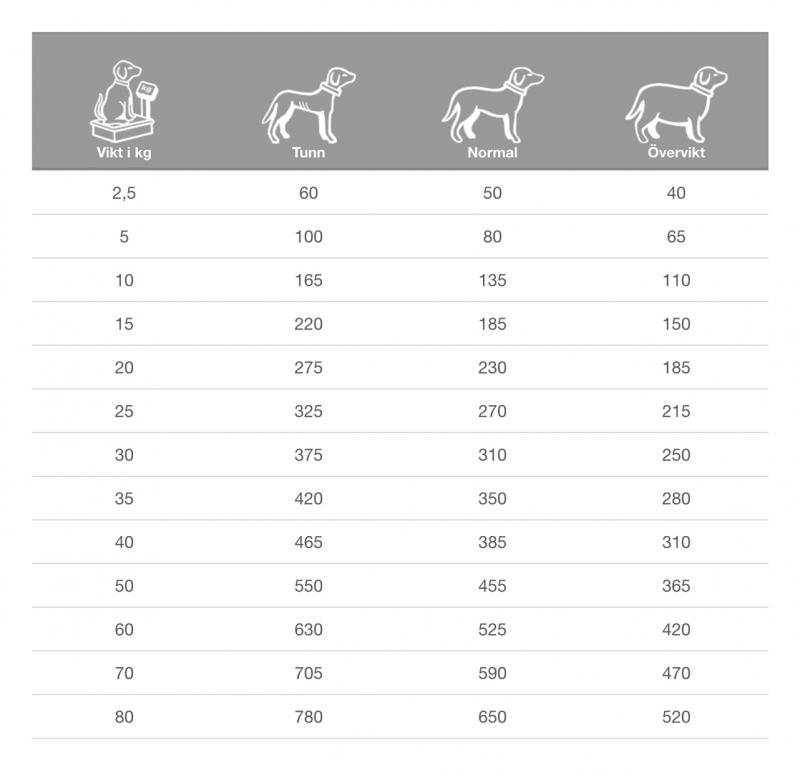 Det dagliga behovet kan variera beroende på faktorer som ras, miljö, säsong och aktivitetsnivå. Vi rekommenderar att du övervakar ditt djur och justerar utfodringsmängden för att passa dess individuella behov.
