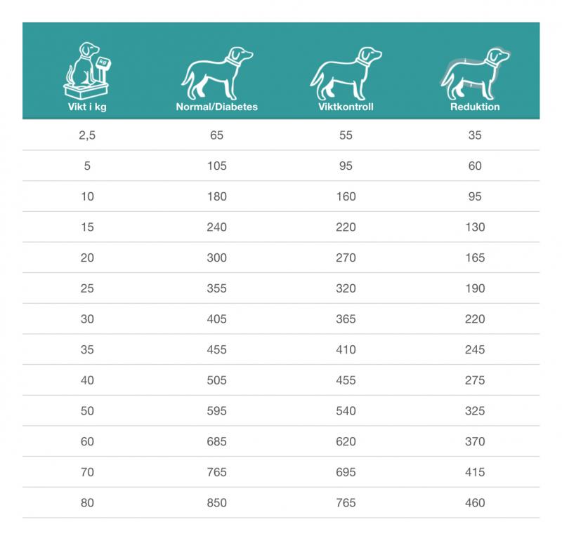 - Lågt innehåll av kalorier och fett men hög halt fibrer och protein gör att du kan ge hunden fulla portioner så att den håller vikten utan att känna sig hungrig.