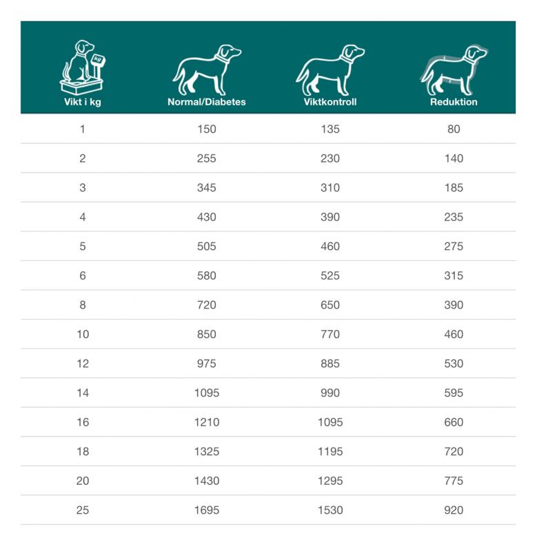 - Lågt innehåll av kalorier och fett men hög halt fibrer och protein gör att du kan servera din hund fulla portioner, så att den tappar vikt utan att känna sig hungrig.
